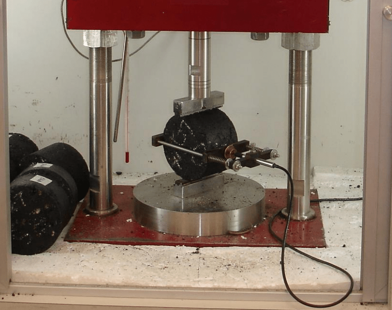 O módulo de resiliência de materiais asfálticos pode ser obtido através da ação de uma carga repetida e o deslocamento recuperável é obtido através de LVDTS – Linear Variable Differential Transformer. No Brasil o principal ensaio para obter este parâmetro elástico das misturas asfálticas é com o ensaio de compressão diametral de cargas repetidas, o mesmo utilizado para obter a resistência a tração porém com carga ciclica, conforme DNIT 135/2018 e Figura 4. Em outros países, como a Austrália, o principal ensaio para obter o módulo de resiliência de misturas asfálticas é o Ensaio de flexão de vigas, conforme descrito na AUSTROADS (2017).