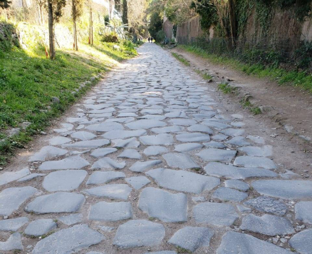 Revestimento: O revestimento é a camada do pavimento que recebe os esforços oriundos do tráfego através do contato pneu-pavimento. Ou seja, esta camada é a que a recebe os esforços estáticos e dinâmicos. O revestimento deve resistir ao esforço solicitante sem sofrer grandes deformações elásticas, plásticas e sem sofrer outros defeitos. Dessa forma, Balbo (2007) descreve que os revestimentos devem ser compostos por materiais bem aglutinados ou colocados de maneira que não permitem sua movimentação horizontal. Alguns exemplos são: rochas justapostas (como ocorre nos pavimentos Romanos da Via Appia Antica), paralelepípedos, blocos intertravados, placas de concreto, concreto compactado com rolo, misturas asfálticas etc. A Figura 4 ilustra o pavimento construído pelos Romanos em 312 a.C.