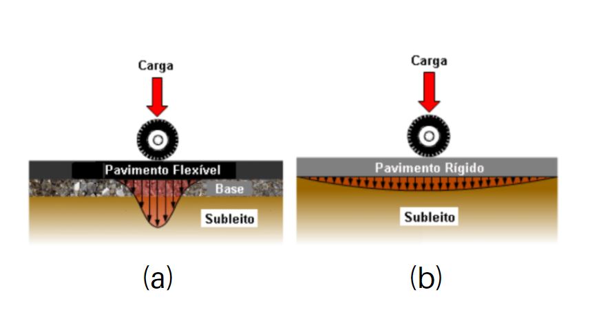 Segundo Bernucci et al (2008), há uma tendência de usar a nomenclatura de pavimentos de concreto de cimento portland e pavimentos asfálticos. A questão é que a generalização do conceito, tratando todos os pavimentos que são constituídos por revestimento asfáltico como flexíveis, pode levar a erros significativos ou classificações ineficientes. Yoder e Witczak (1975) classificam os pavimentos em função da forma de distribuição de tensões na estrutura. Os autores descrevem que em pavimentos flexíveis, as tensões são concentradas próximas ao ponto de aplicação da carga, conforme Figura 5a. Por outro lado, os autores descrevem que em pavimentos rígidos, as tensões se distribuem em uma área maior, o que resulta em esforços verticais menores sobre o subleito, conforme Figura 5b. Há ainda um comportamento intermediário, chamado de pavimento semirrígido, o qual acontece quando a camada de base apresenta elevada rígidez. Este último deixaremos para um artigo futuro.