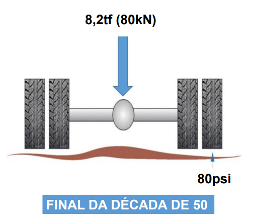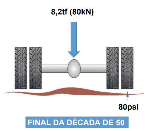Cava (2021) realizou uma pesquisa na rodovia de alto volume de tráfego e coletou a pressão de enchimento em uma amostra de 1860 pneus de veículos comerciais. O autor observou apenas 1,35% dos pneus analisados apresentavam pressão de enchimento dos pneus compatível com a do eixo rodoviário padrão. Ou seja, 98,65% da amostra apresentava pressões maiores do que as utilizadas no método de dimensionamento de pavimentos do Brasil, conforme Figura 3.