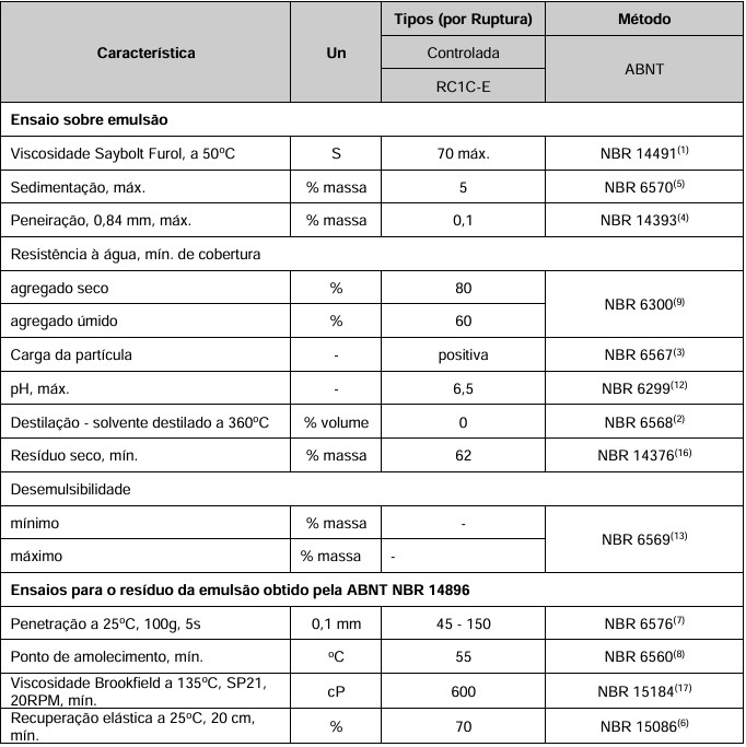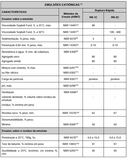 As Tabelas abaixo apresentam a especificação de emulsões catiônicas convencionais e modificadas por polímero, respectivamente, conforme indicado pelo DER-SP (2024).