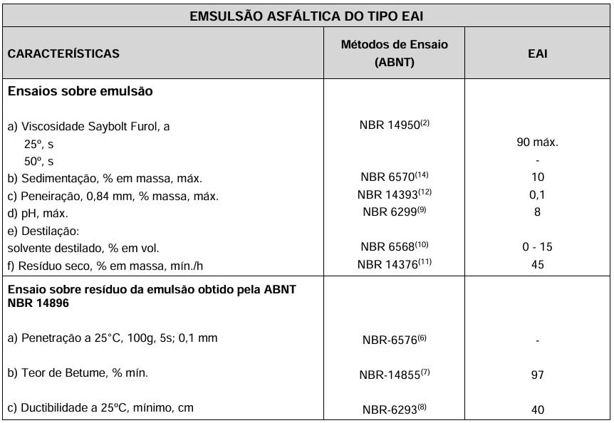 A Tabela abaixo apresenta a especificação para a emulsão asfáltica de imprimação.
