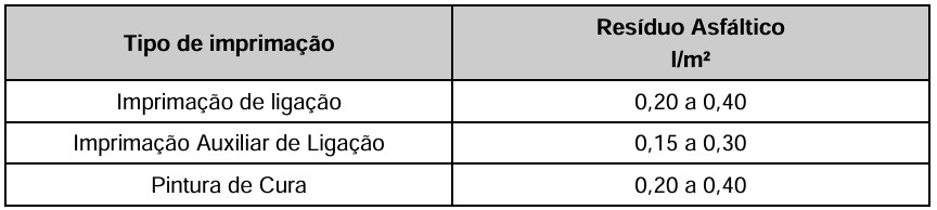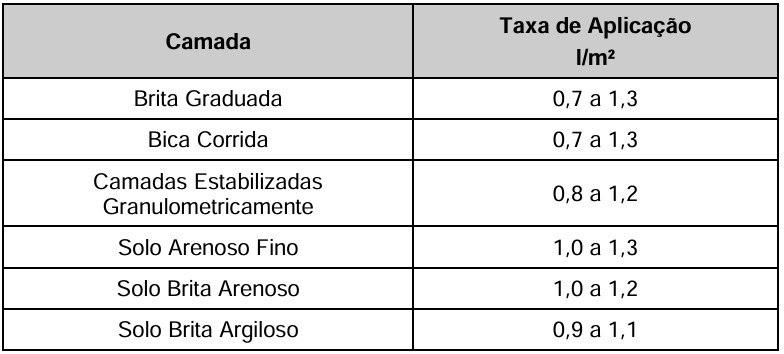 Vale ressaltar que as taxas apresentadas são válidas para o uso de Asfalto Diluído, isto é, não devem ser consideradas para EAI. As taxas de aplicação de EAI devem ser fornecidas pelo fabricante.