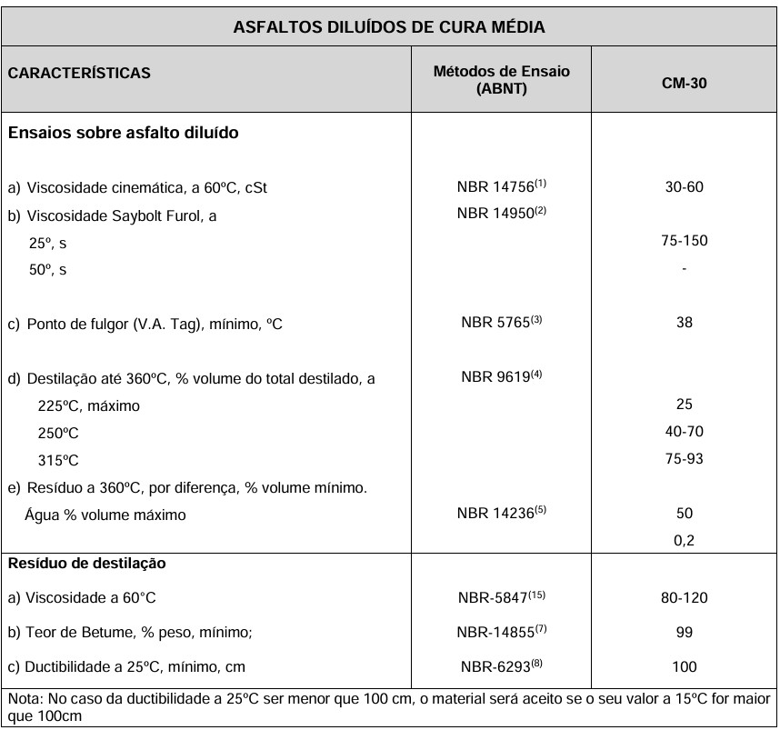 A Tabela abaixo apresenta as especificações para Asfalto Diluído CM-30, indicado pelo DER-SP para uso em imprimação asfáltica.