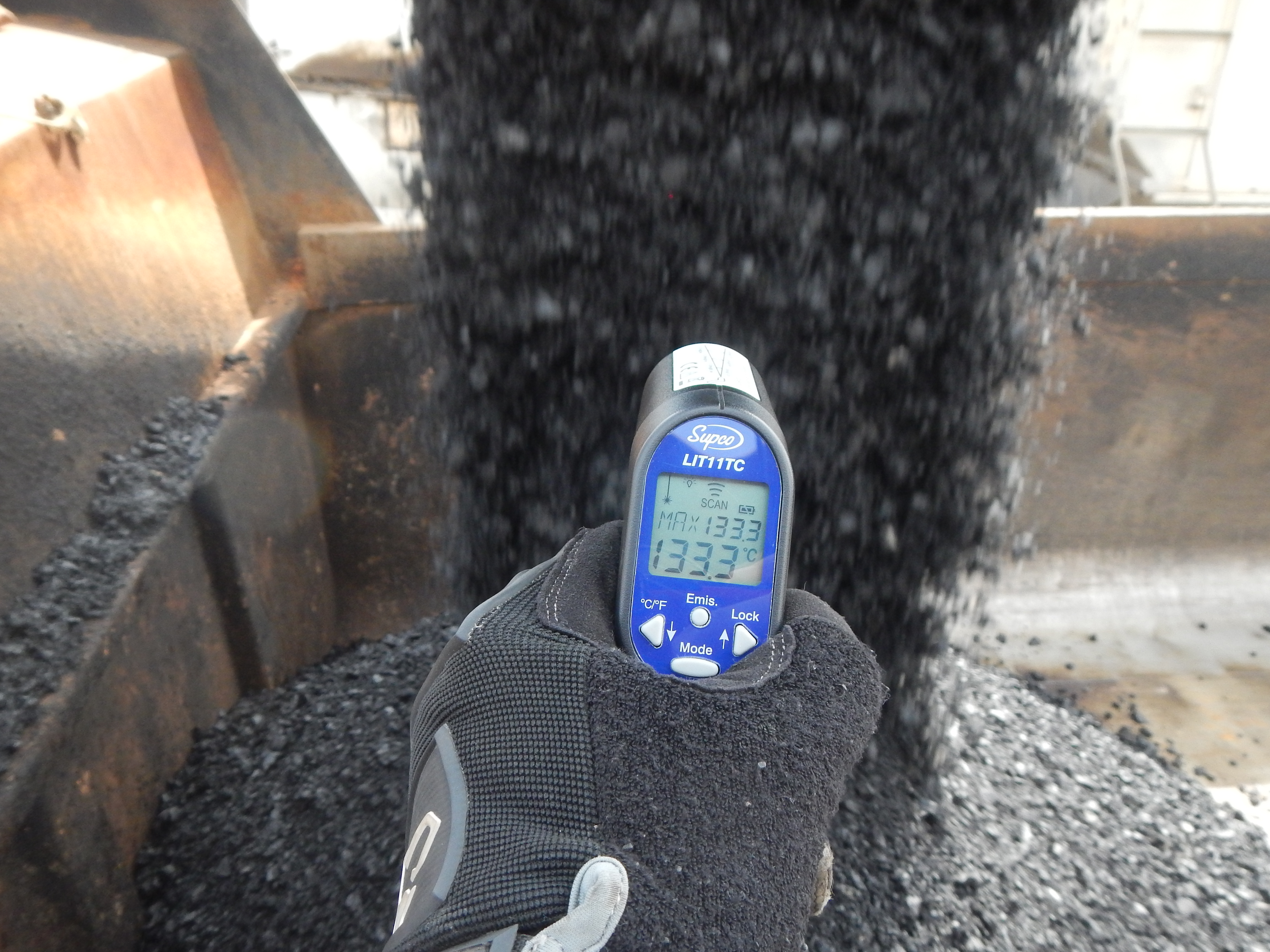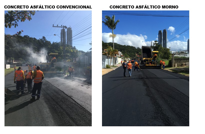 A redução de temperatura contribui para uma menor pegada de carbono da obra de pavimentação, sendo um aspecto relevante em projetos que buscam certificações ambientais. Além disso, a menor emissão de fumos e vapores melhora as condições de trabalho para os operários. As duas fotos abaixo ilustram a diferença do ambiente de trabalho com o uso de misturas asfálticas a quente e mornas.