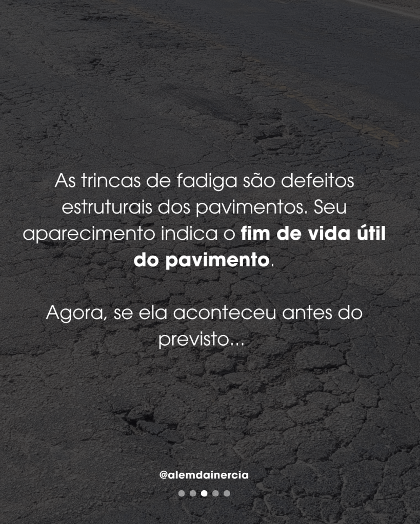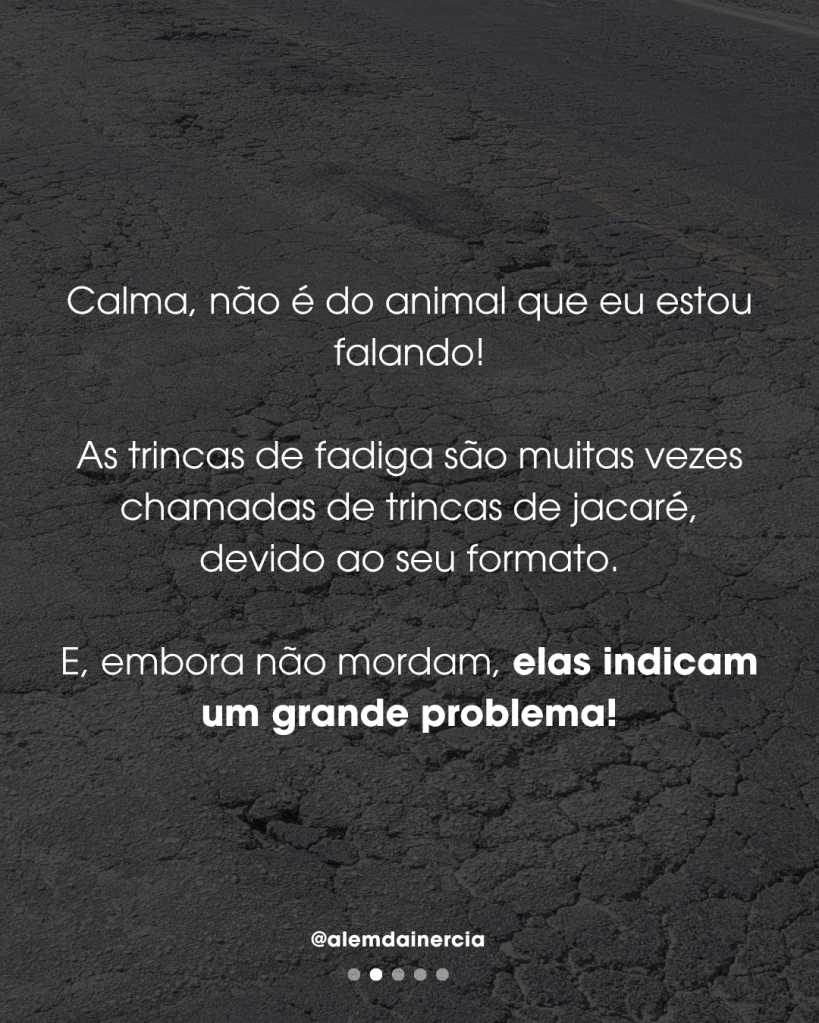 Calma, não é do animal que eu estou falando. As trincas de fadiga são muitas vezes chamadas de trincas de jacaré (ou couro de jacaré), devido ao seu formato. E, embora não mordam, elas indicam um grande problema. As trincas de fadiga são defeitos estruturais. Seu aparecimento indica o fim de vida útil do pavimento. Agora, se elas acontecem antes do previsto… você tem um problema ainda maior. Acompanhe este carrossel para entender mais as consequências deste defeito.